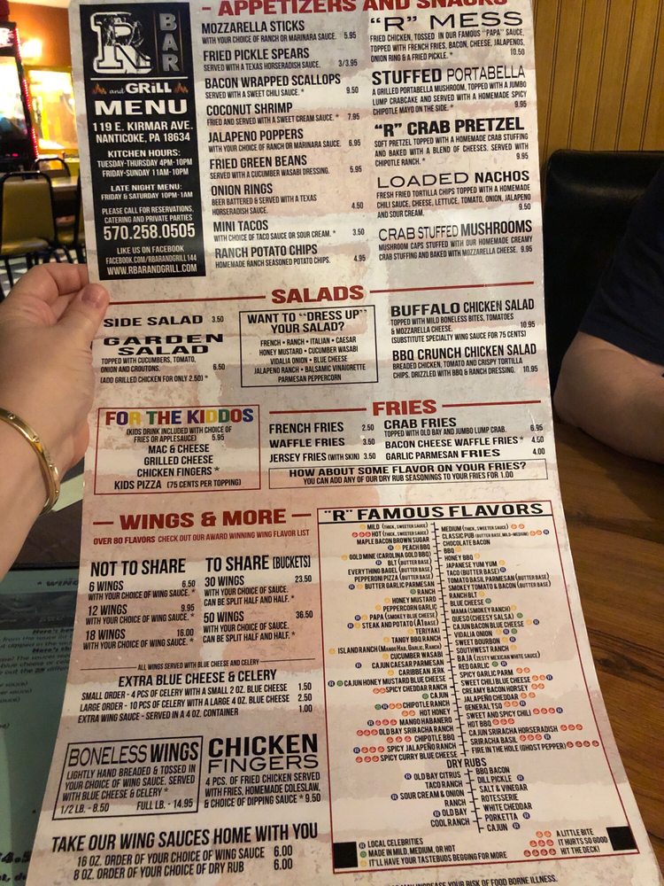 Introducing R Bar And Grill, a vibrant spot in Nanticoke, PA, known for its mouthwatering chicken wings, American cuisine, and lively bar atmosphere. With a range of vegetarian options, this restaurant offers something for everyone. Customers rave about the friendly staff, fast service, and daily specials. Highlights include a variety of wing sauces, creative drinks, and flavorful burgers. The spacious and kid-friendly environment makes it perfect for gatherings with friends and family. Enjoy outdoor seating, free Wi-Fi, and activities like pool and jukebox. Whether you're a regular or first-time visitor, R Bar And Grill promises a fun and delicious dining experience. Visit on Tuesday, Wednesday, or Friday for the best nights out!